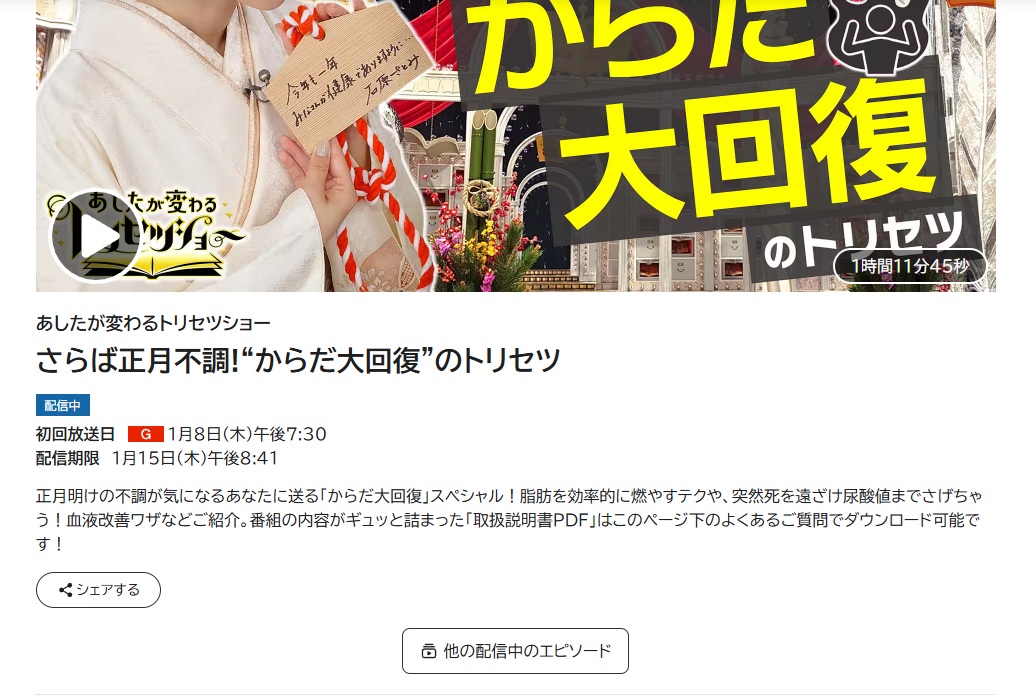 昨晩たまたま、時々録画してチェックしているNHKの「あしたが変わるトリセツショー」で「さらば正月不調!“からだ大回復”のトリセツ」と題した番組を放送していたので、連れ合いと一緒に観てみた。